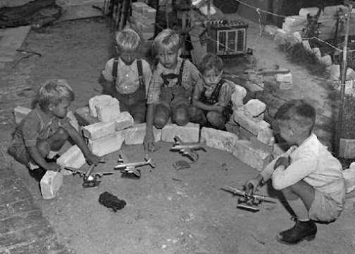 | Niños berlineses jugando a simular el puente aereo en el aeropuerto de Tempelhof.Seguramente los aviones con los que juegan llegaran a Berlin gracias al puente aereo aliado. |